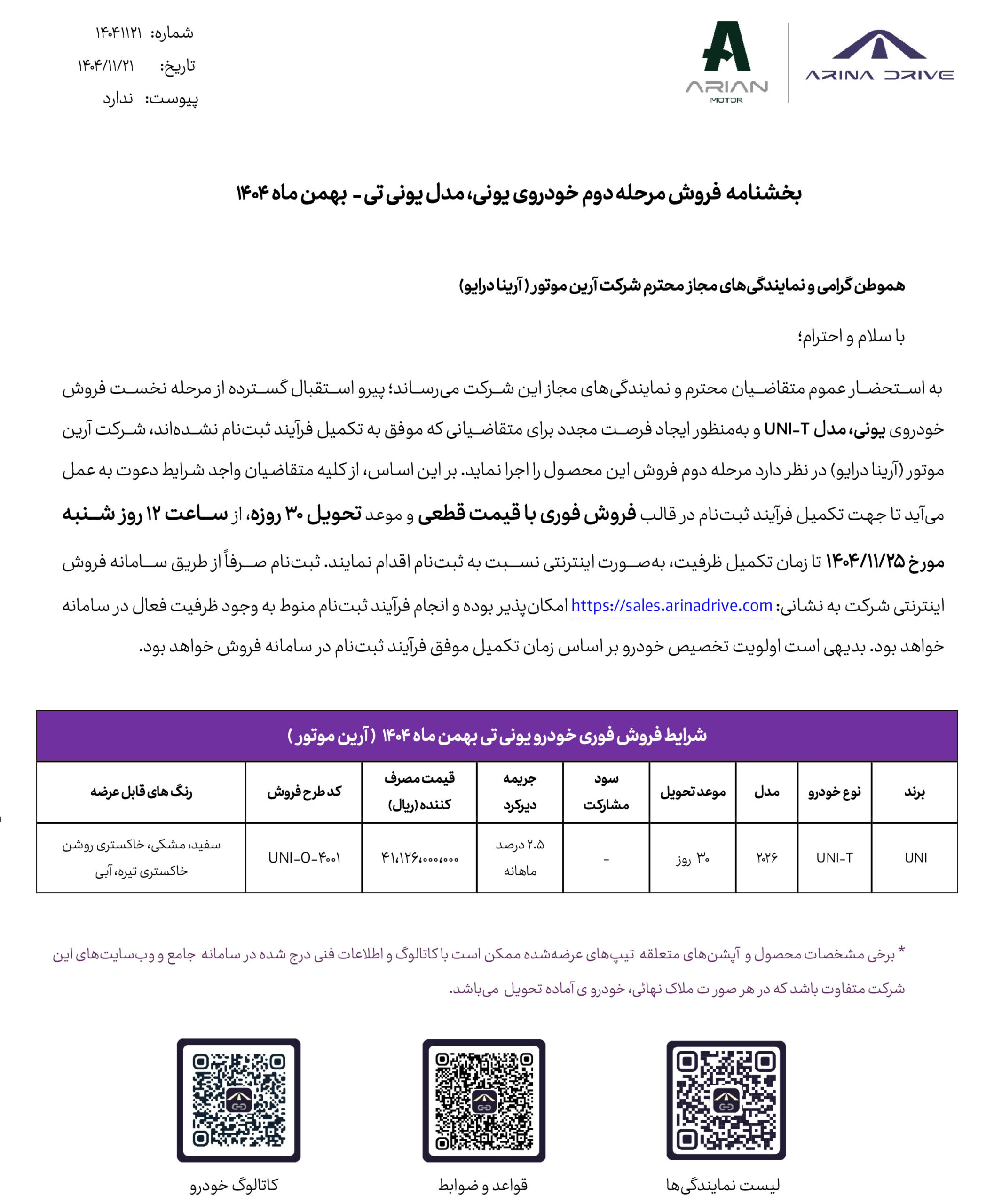 بخشنامه فروش مرحله دوم خودروی یونی، مدل یونیتی- بهمن ماه 1404